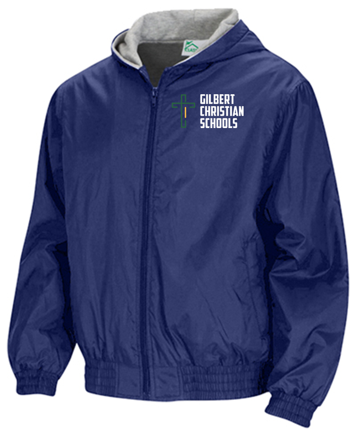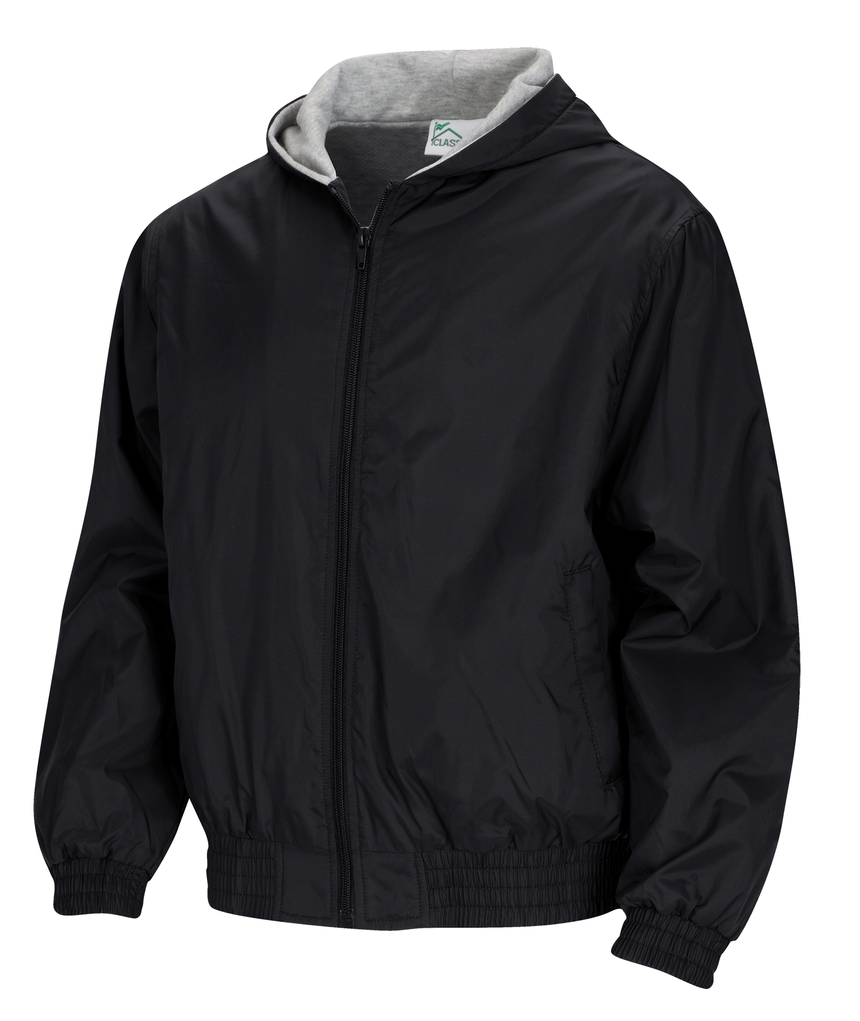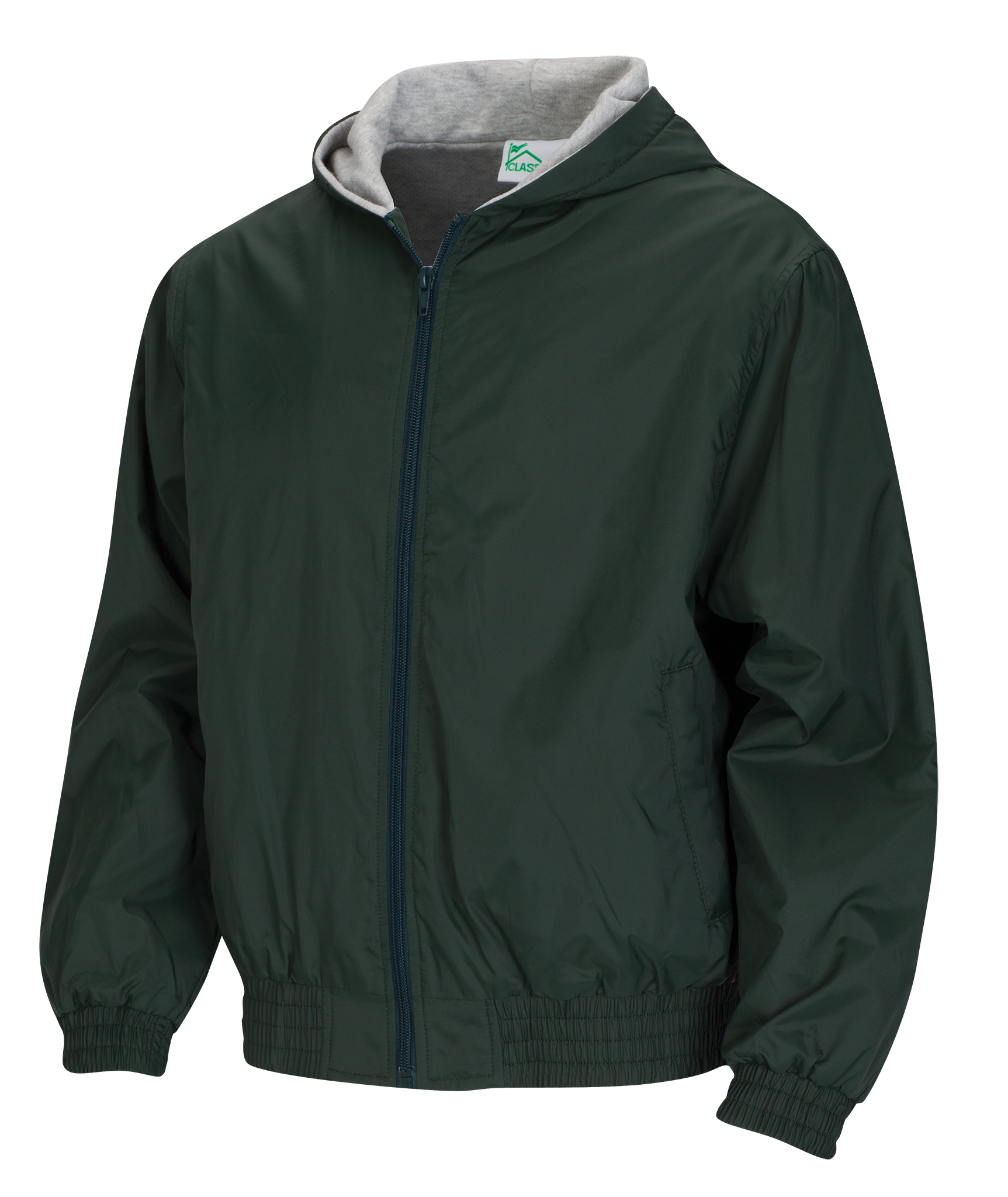 Adult size zip front water-resistant, hip-length nylon taffeta jacket is lined with lightweight brushed fleece for early morning warmth. Elastic waist and cuffs provide a snug yet forgiving fit. Attached hood w/ drawstring. 2 outer pockets, 1 chest inner pocket. Outer shell is 100% Nylon, inner liner is brushed polyester fleece.