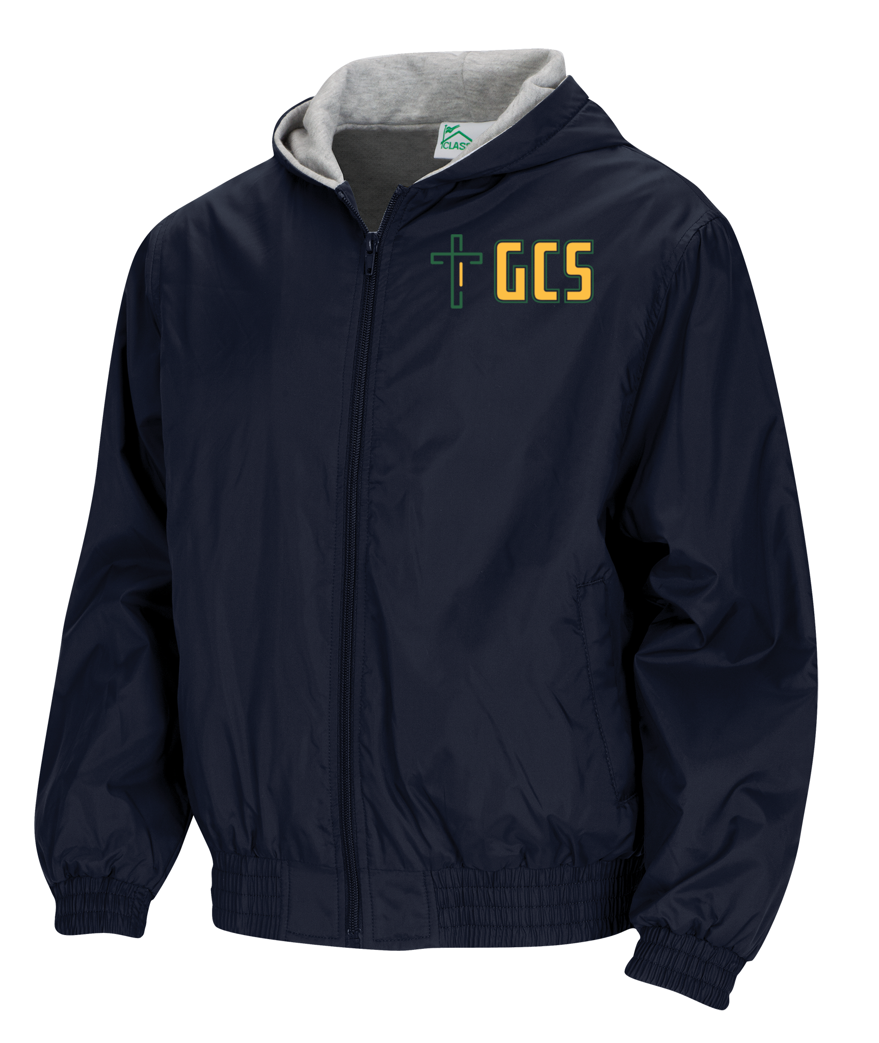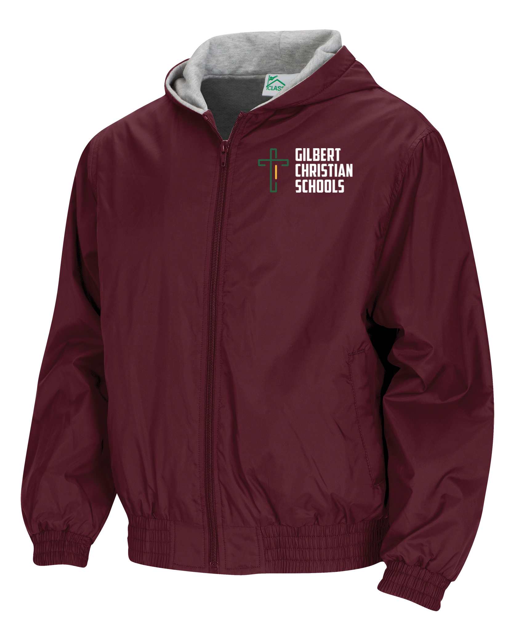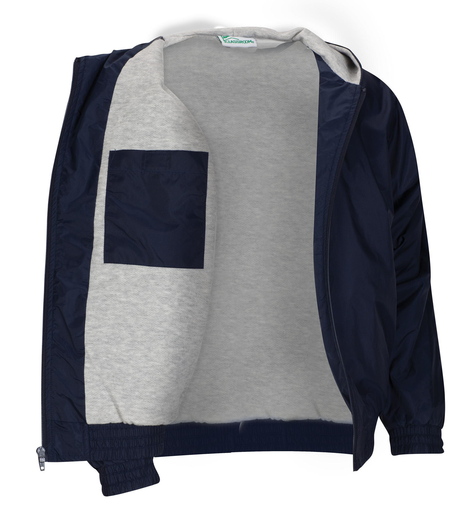 Adult size zip front water-resistant, hip-length nylon taffeta jacket is lined with lightweight brushed fleece for early morning warmth. Elastic waist and cuffs provide a snug yet forgiving fit. Attached hood w/ drawstring. 2 outer pockets, 1 chest inner pocket. Outer shell is 100% Nylon, inner liner is brushed polyester fleece.