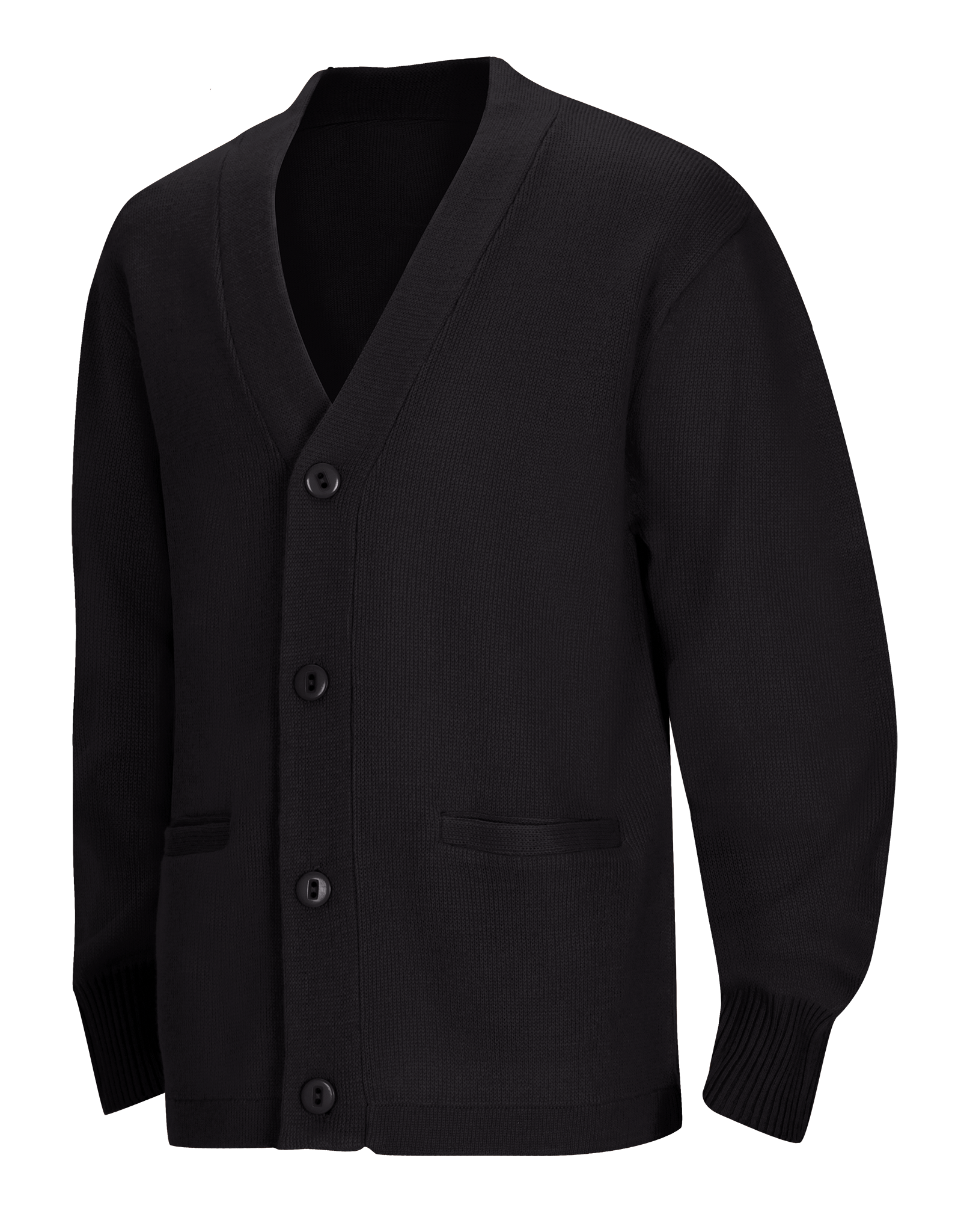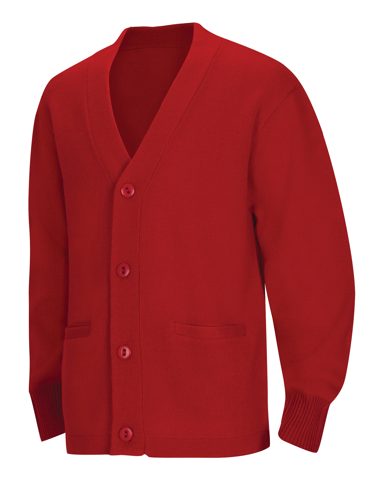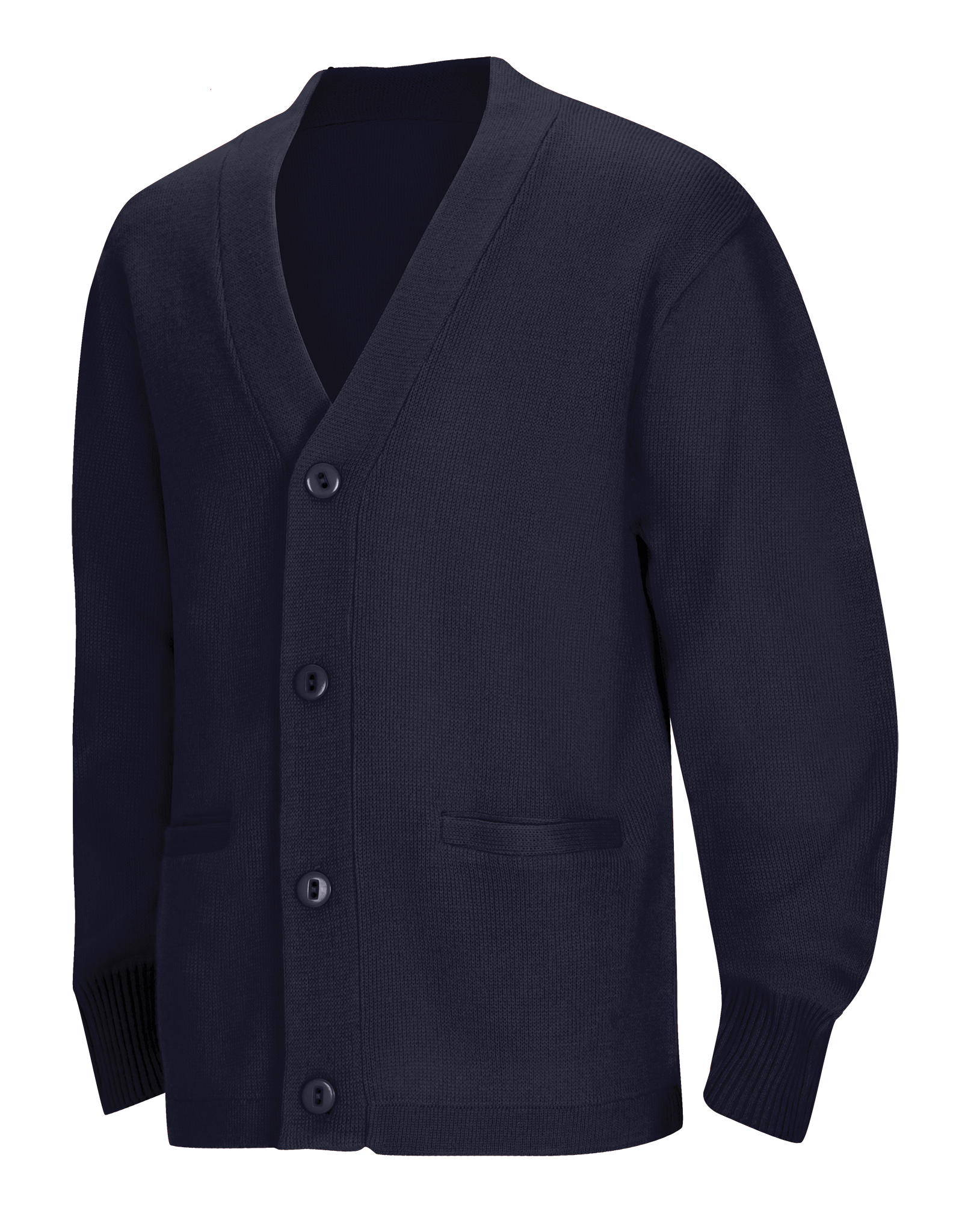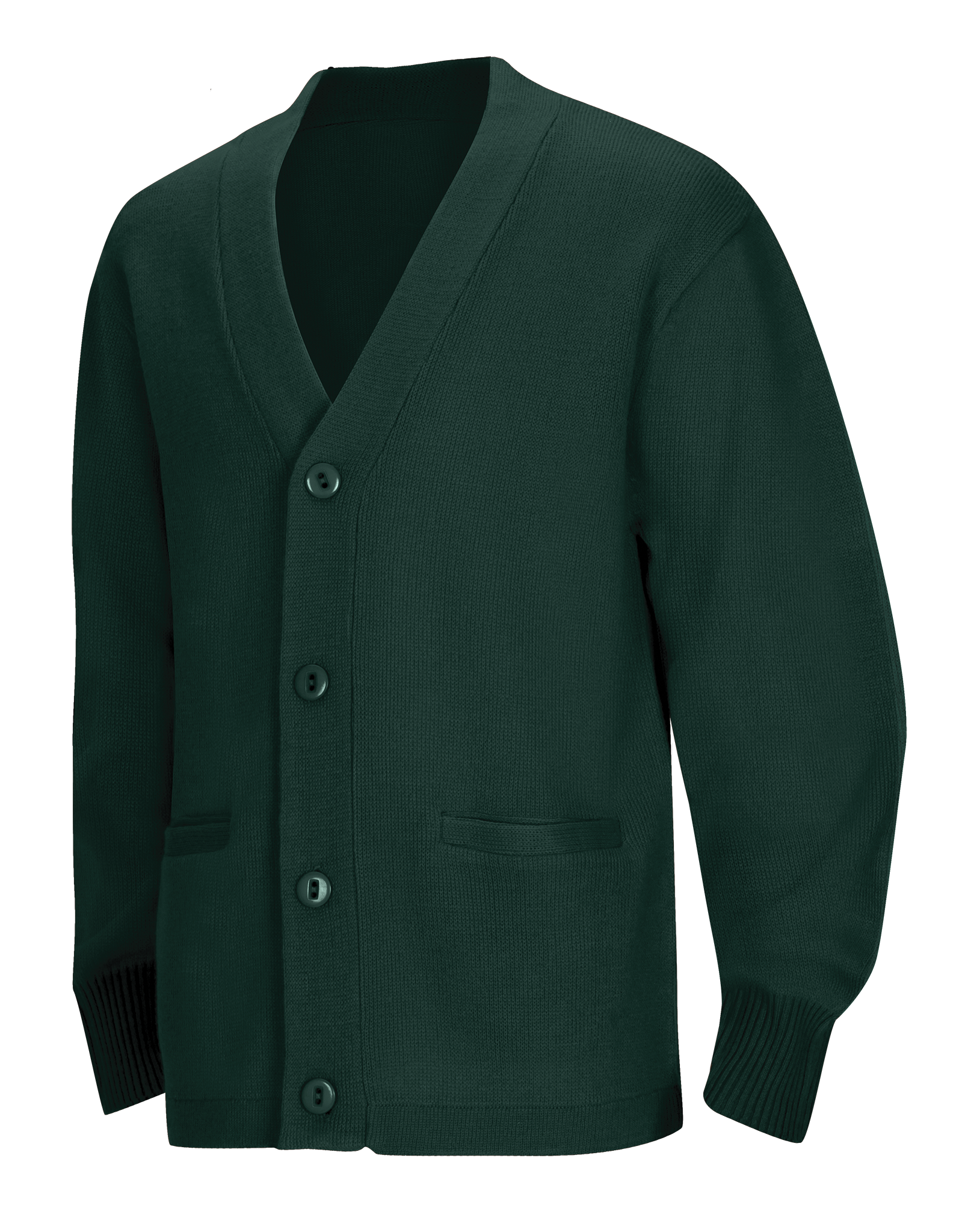Adult Unisex Cardigan Sweater, 100% Acrylic flat knit has 5 button placket and two functional welt pockets. Machine washable.