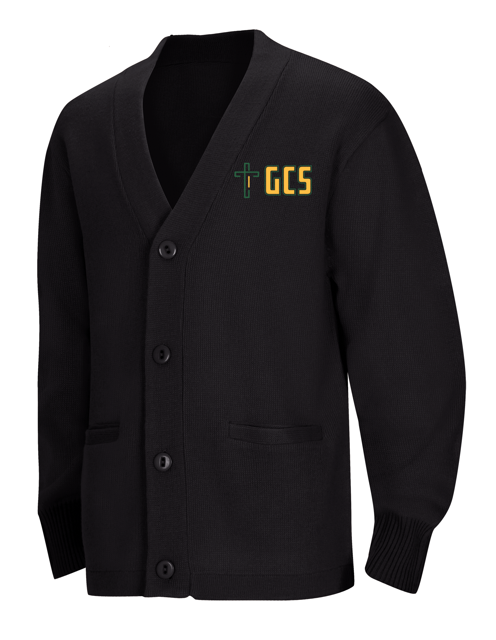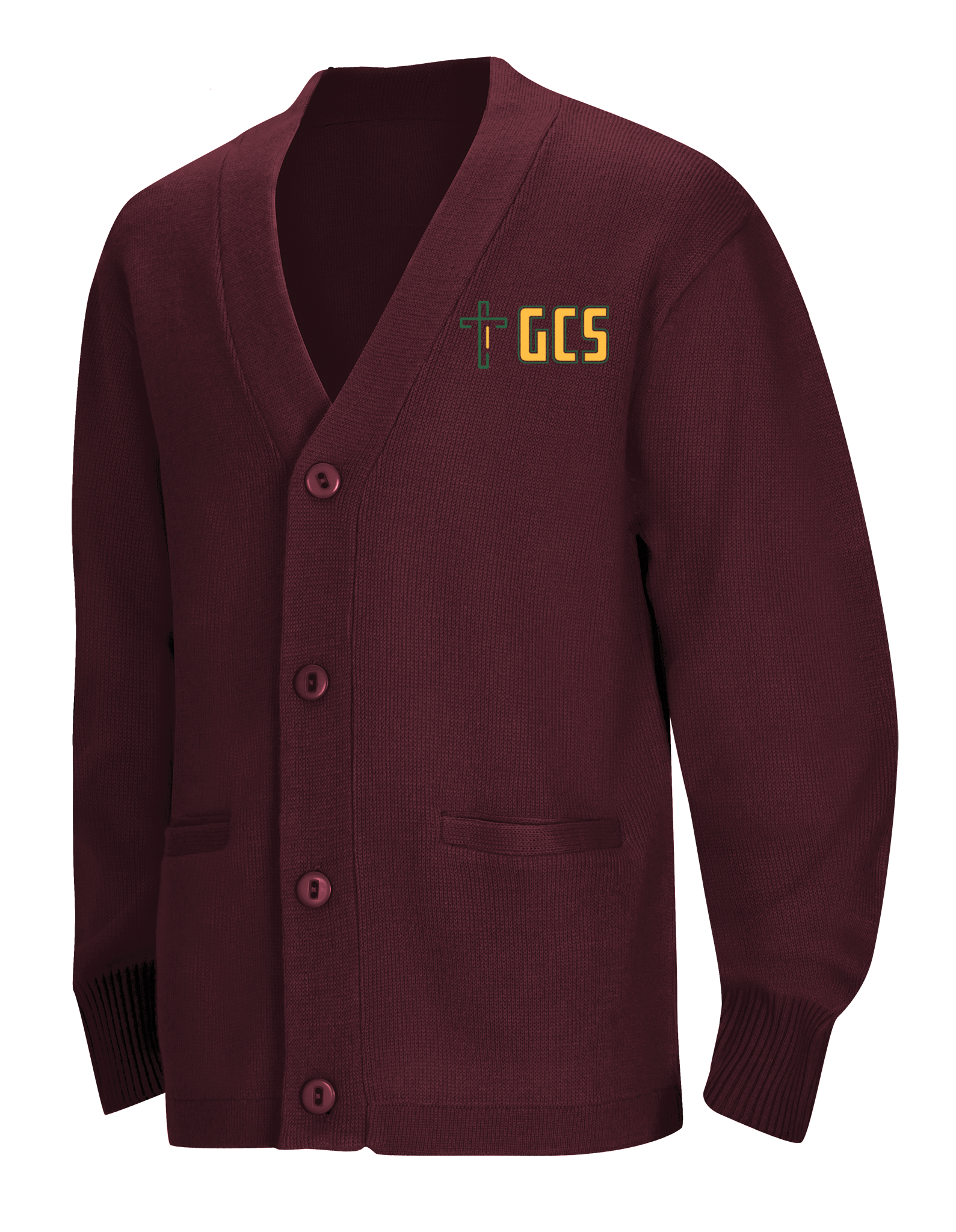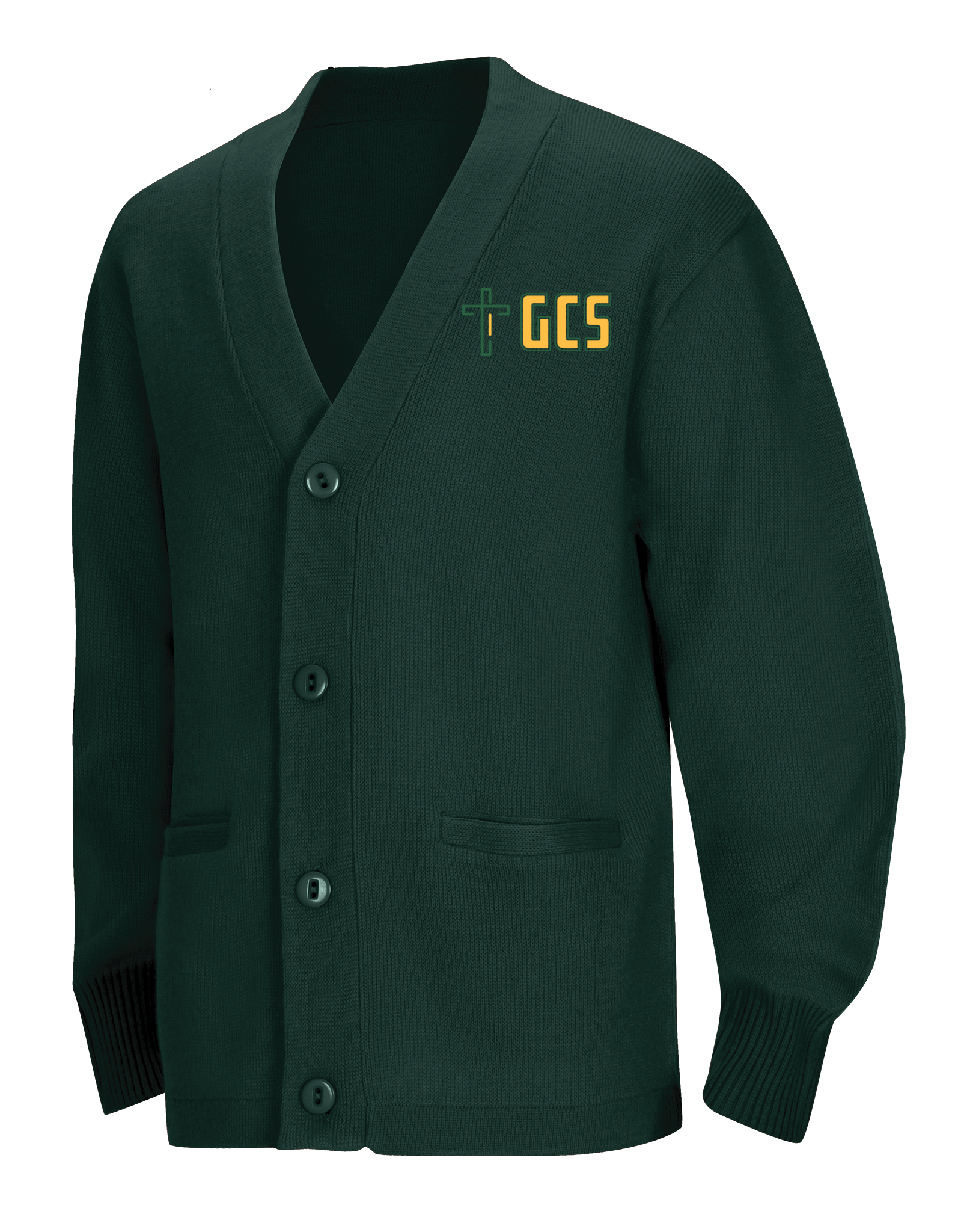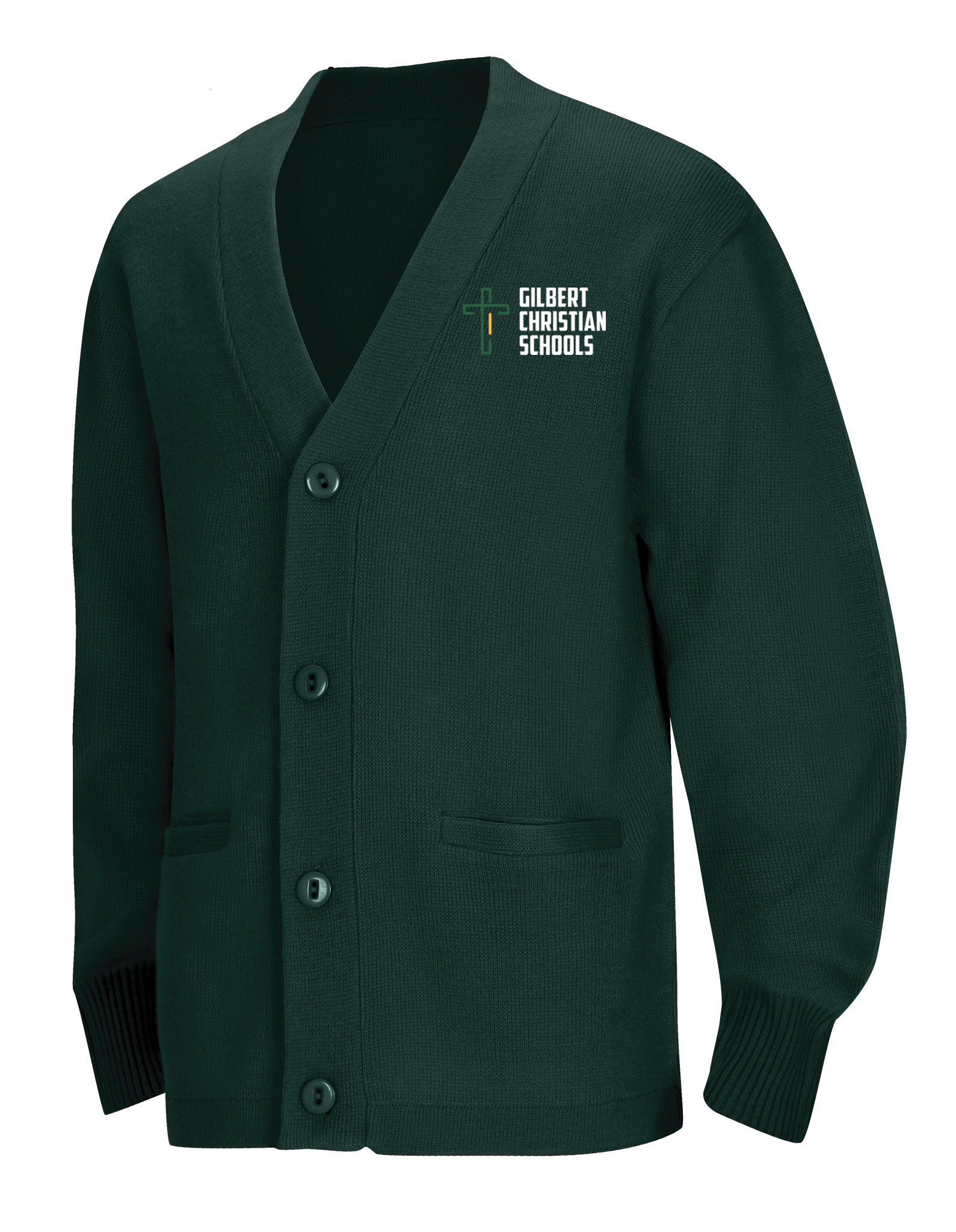 Adult Unisex Cardigan Sweater, 100% Acrylic flat knit has 5 button placket and two functional welt pockets. Machine washable.