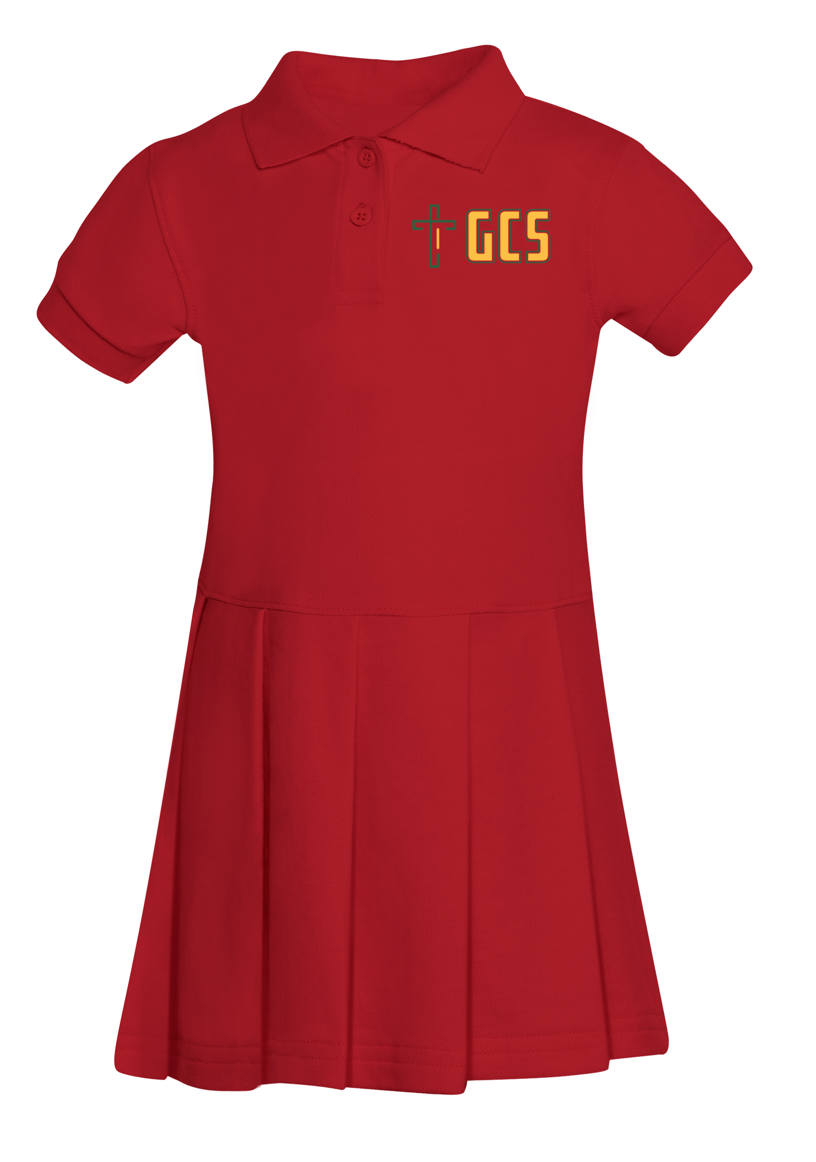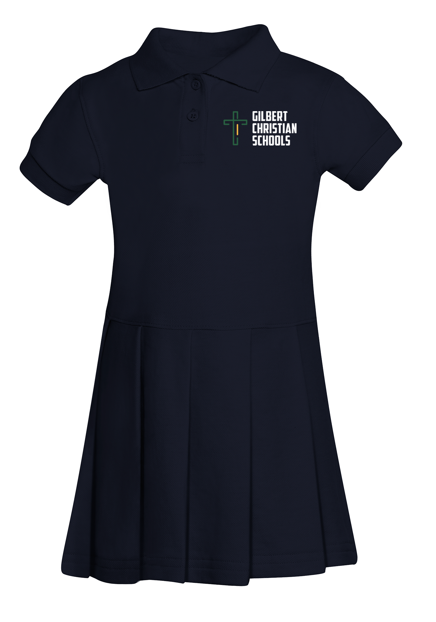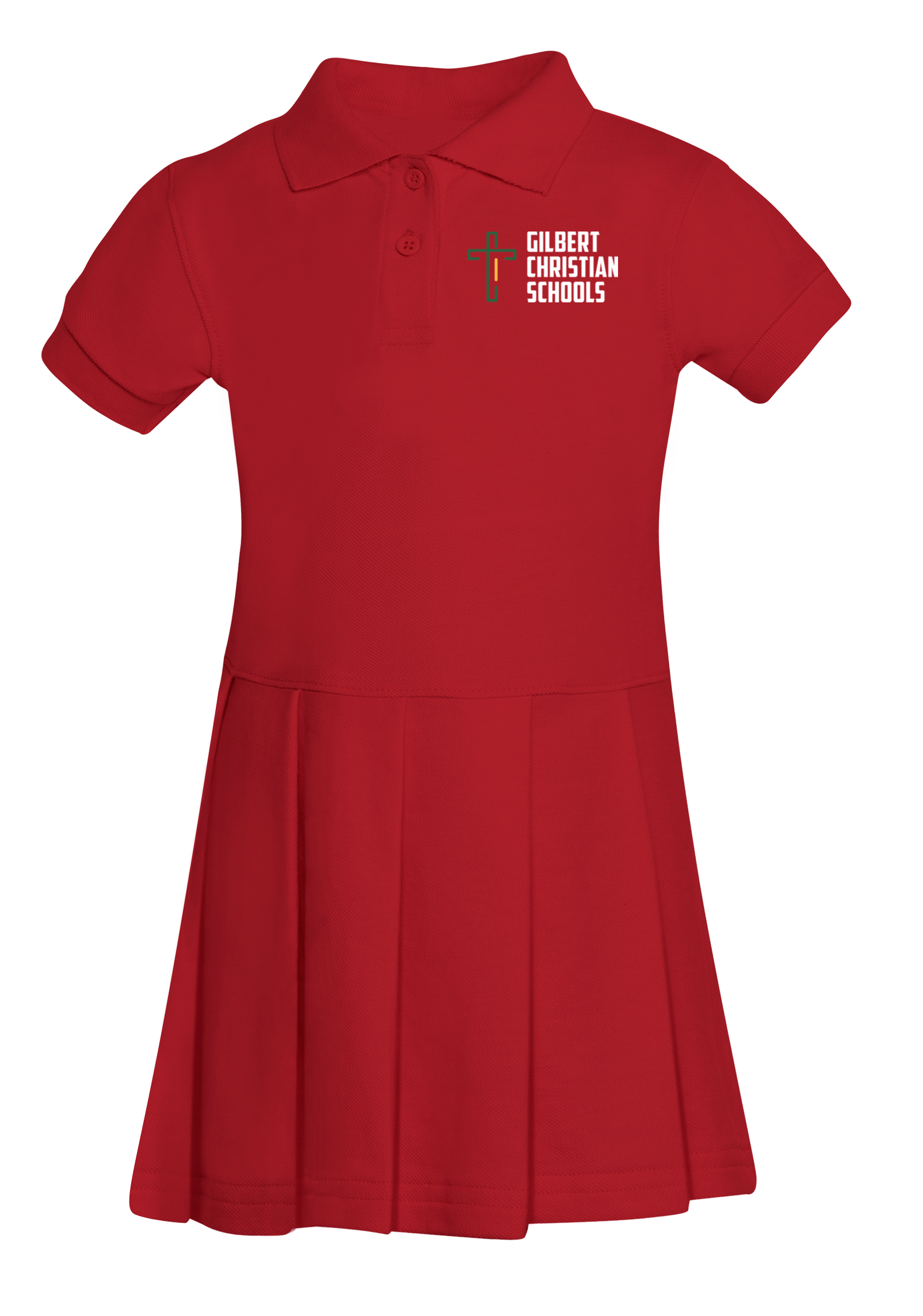 Girls combed cotton, ring spun pique knit polo dress with matching ribbed collar and banded sleeves, three-button front placket with dyed-to-match buttons, and drop waist with pleated skirt. 60% Cotton/40% Polyester knit. THERE ARE NO EXCHANGES OR RETURNS on DISCOUNTED items.