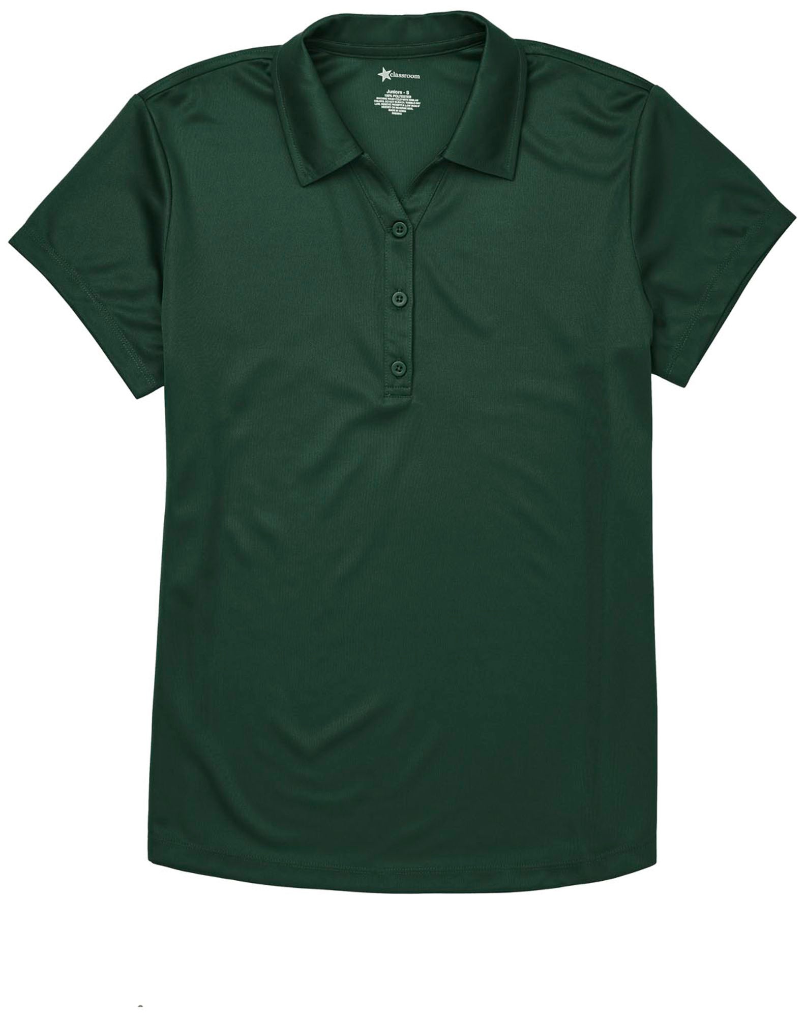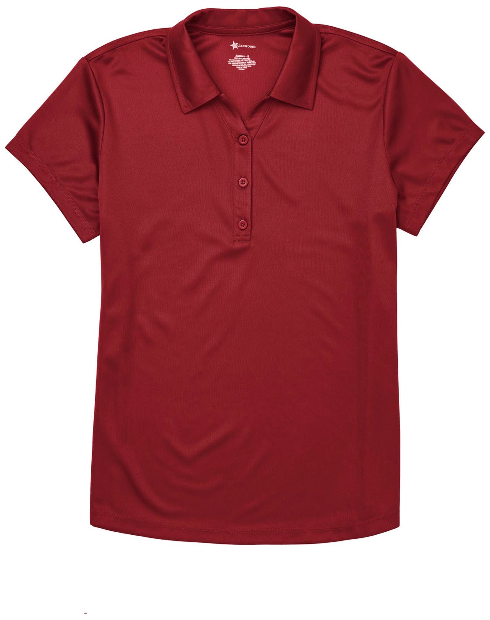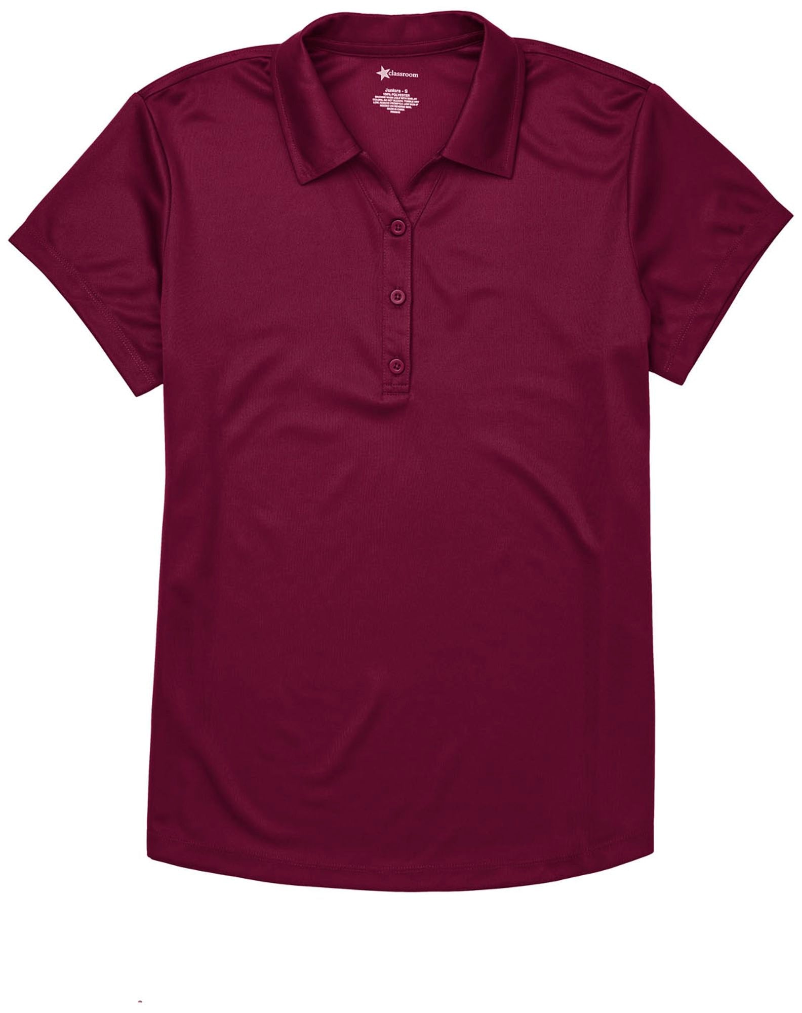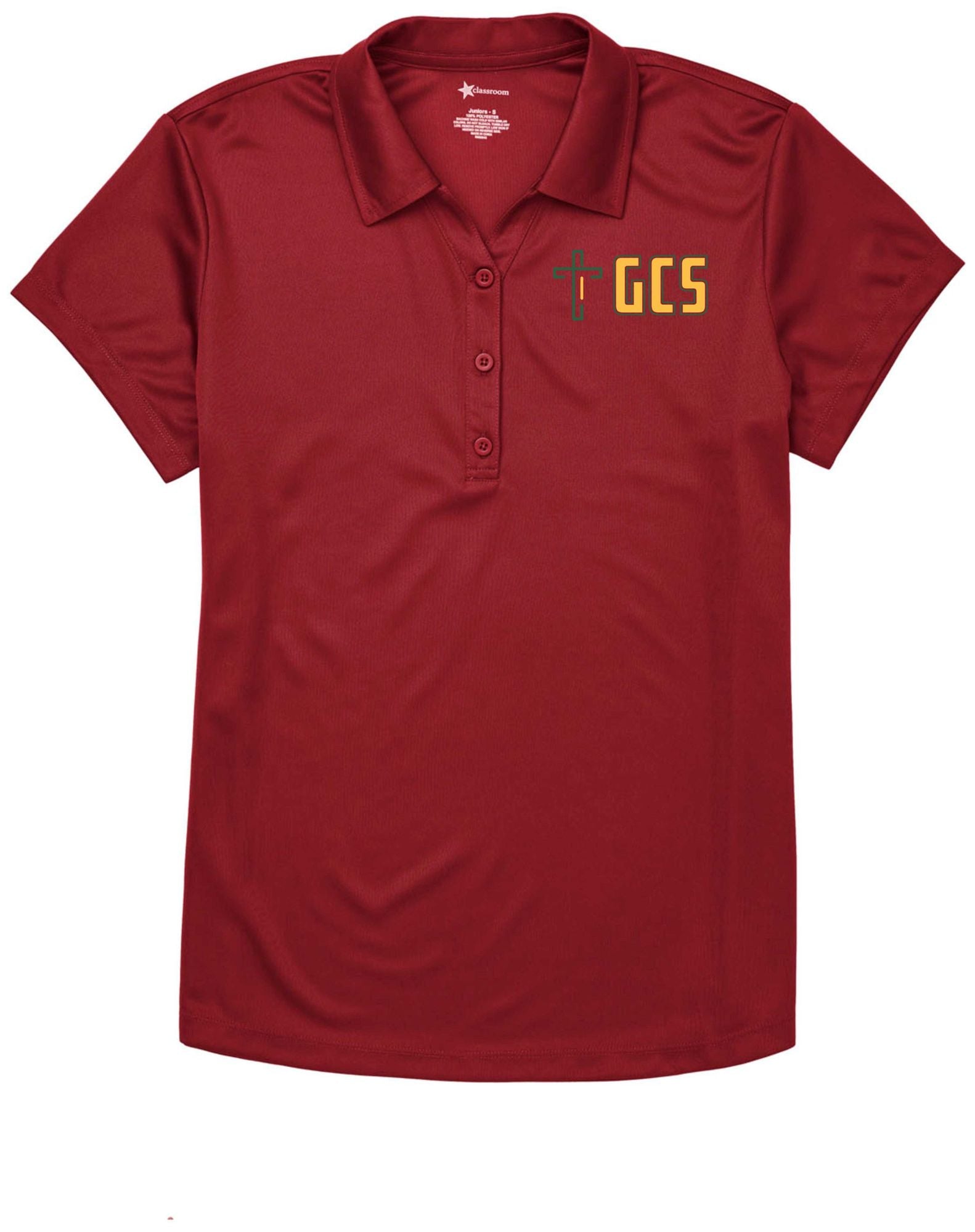 Feminine fit moisture wicking polo with matching ribbed collar, three button placket with dyed-to-match buttons. Stylish curved hemline with v-notch detail on sleeves. 100% Polyester. THERE ARE NO EXCHANGES OR RETURNS on DISCOUNTED items.