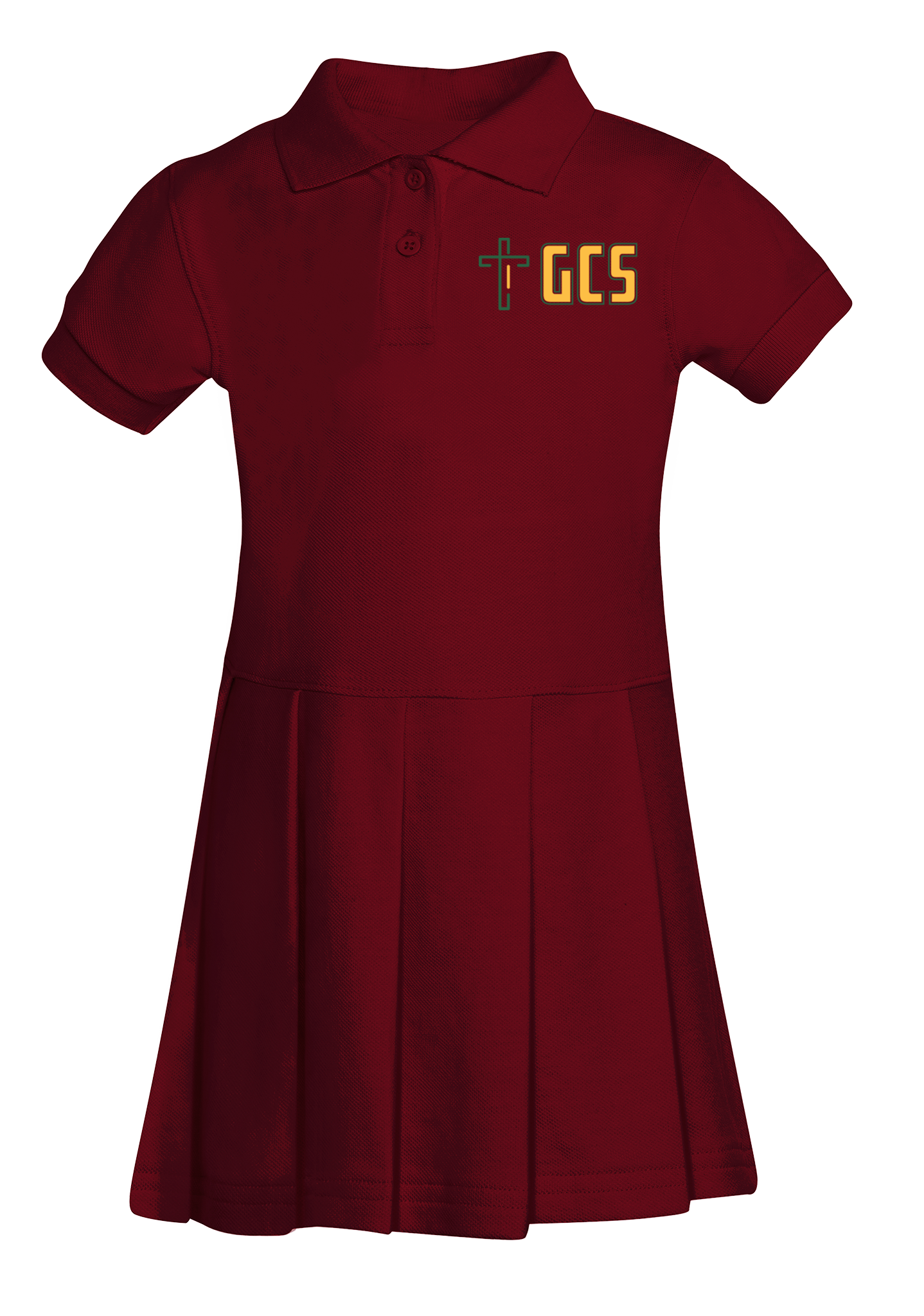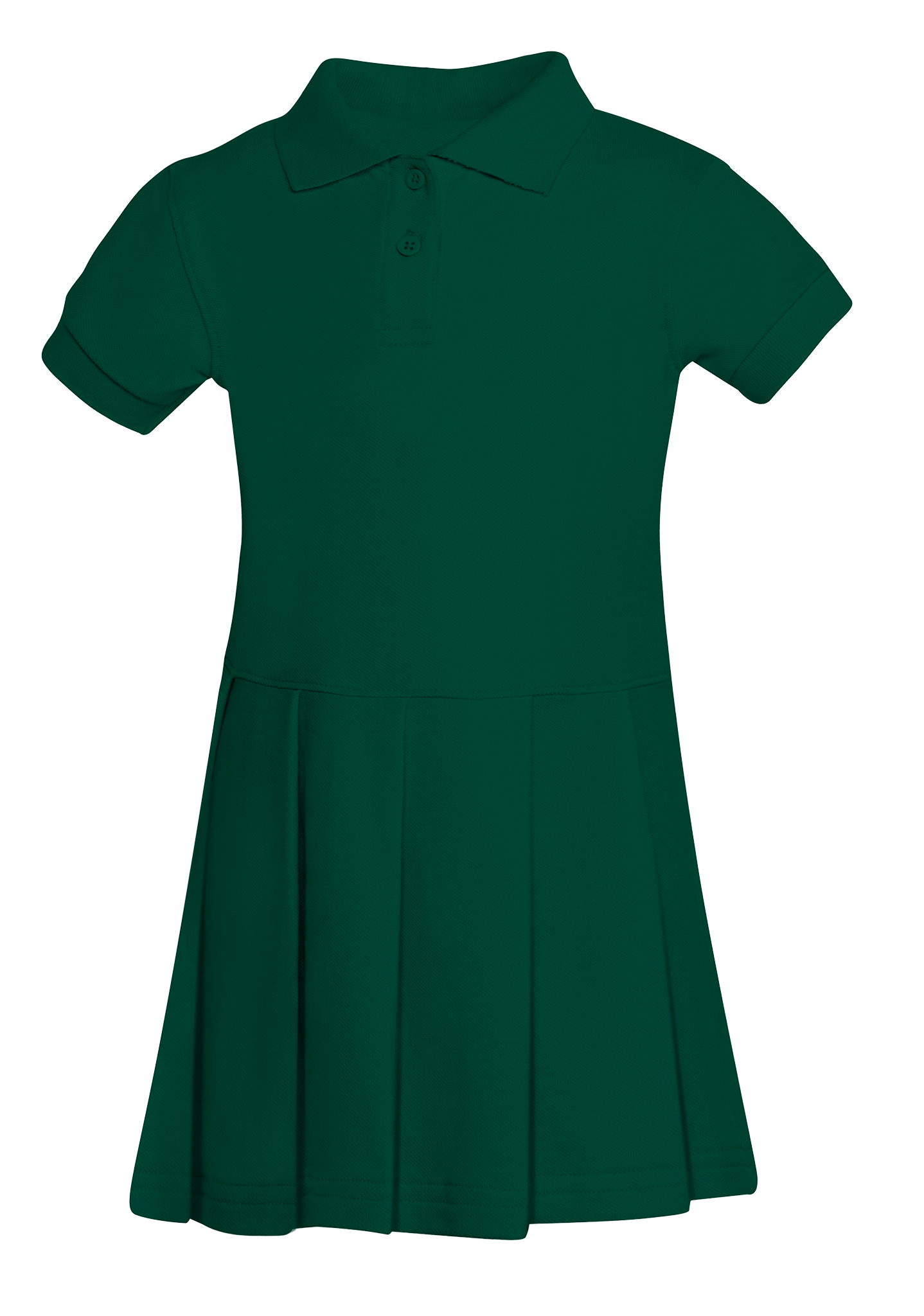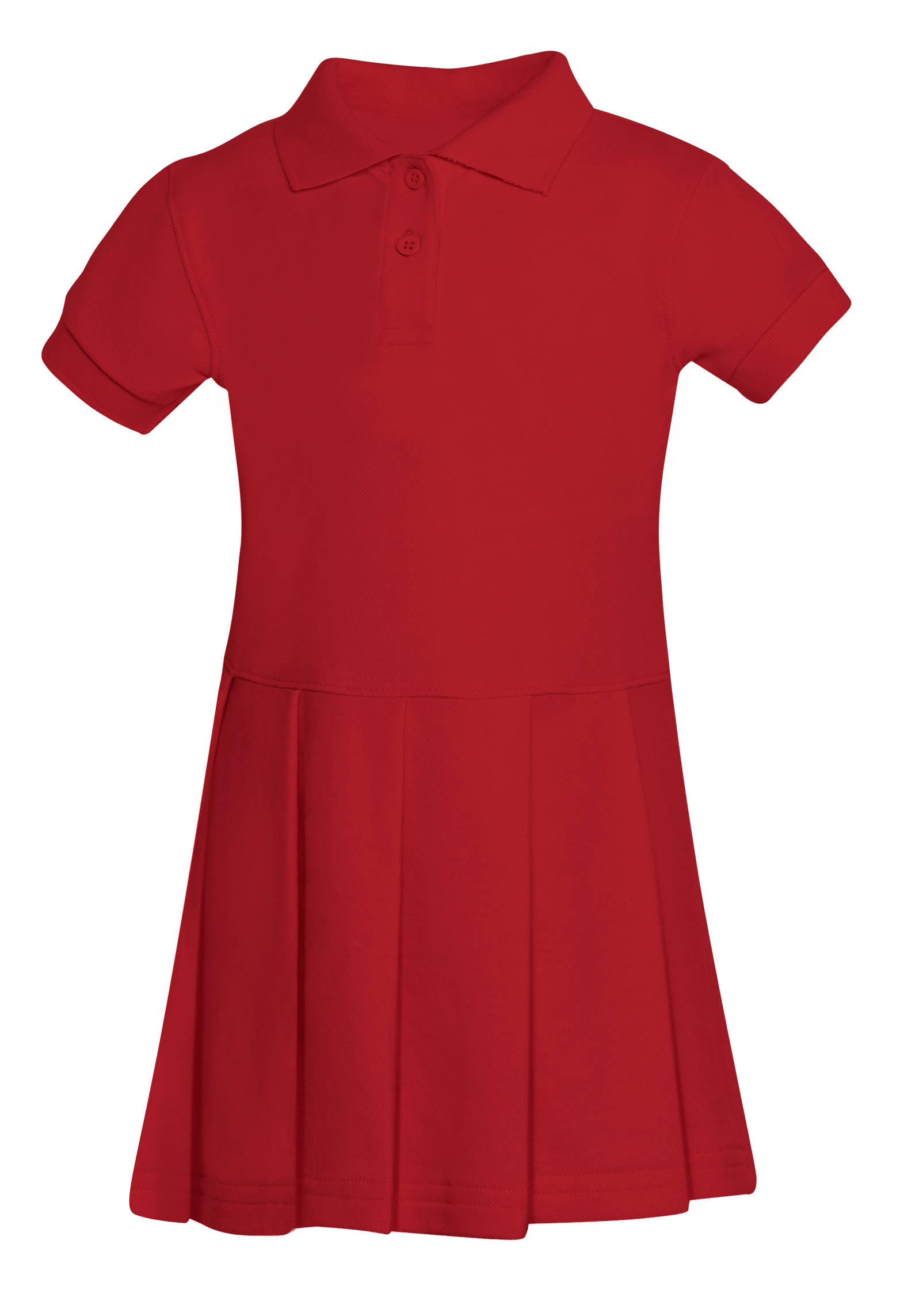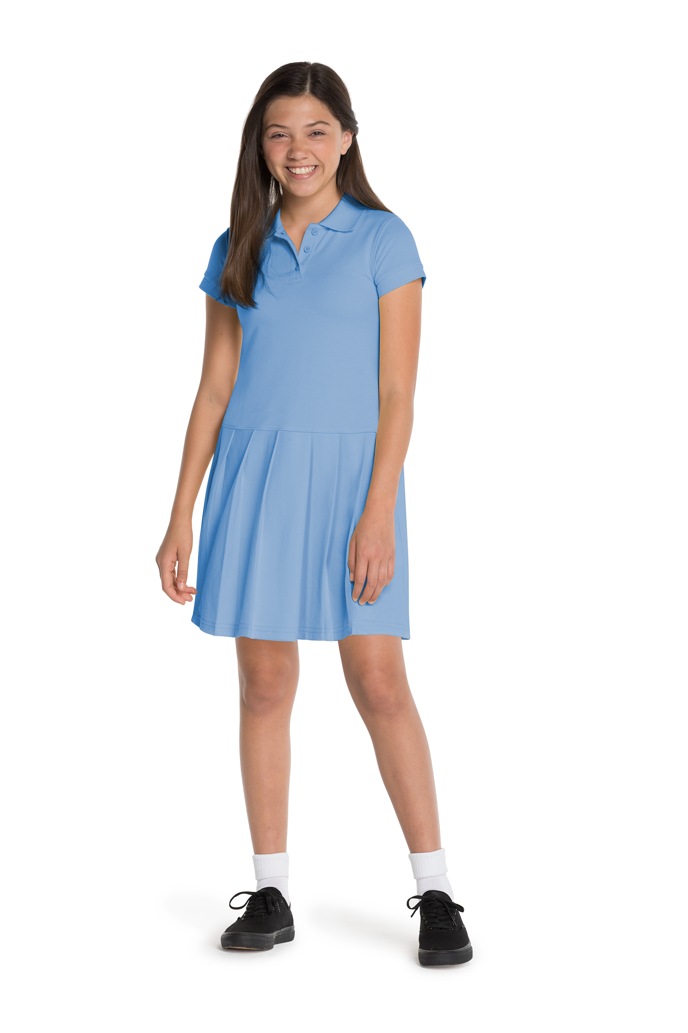 Girls combed cotton, ring spun pique knit polo dress with matching ribbed collar and banded sleeves, three-button front placket with dyed-to-match buttons, and drop waist with pleated skirt. 60% Cotton/40% Polyester knit.