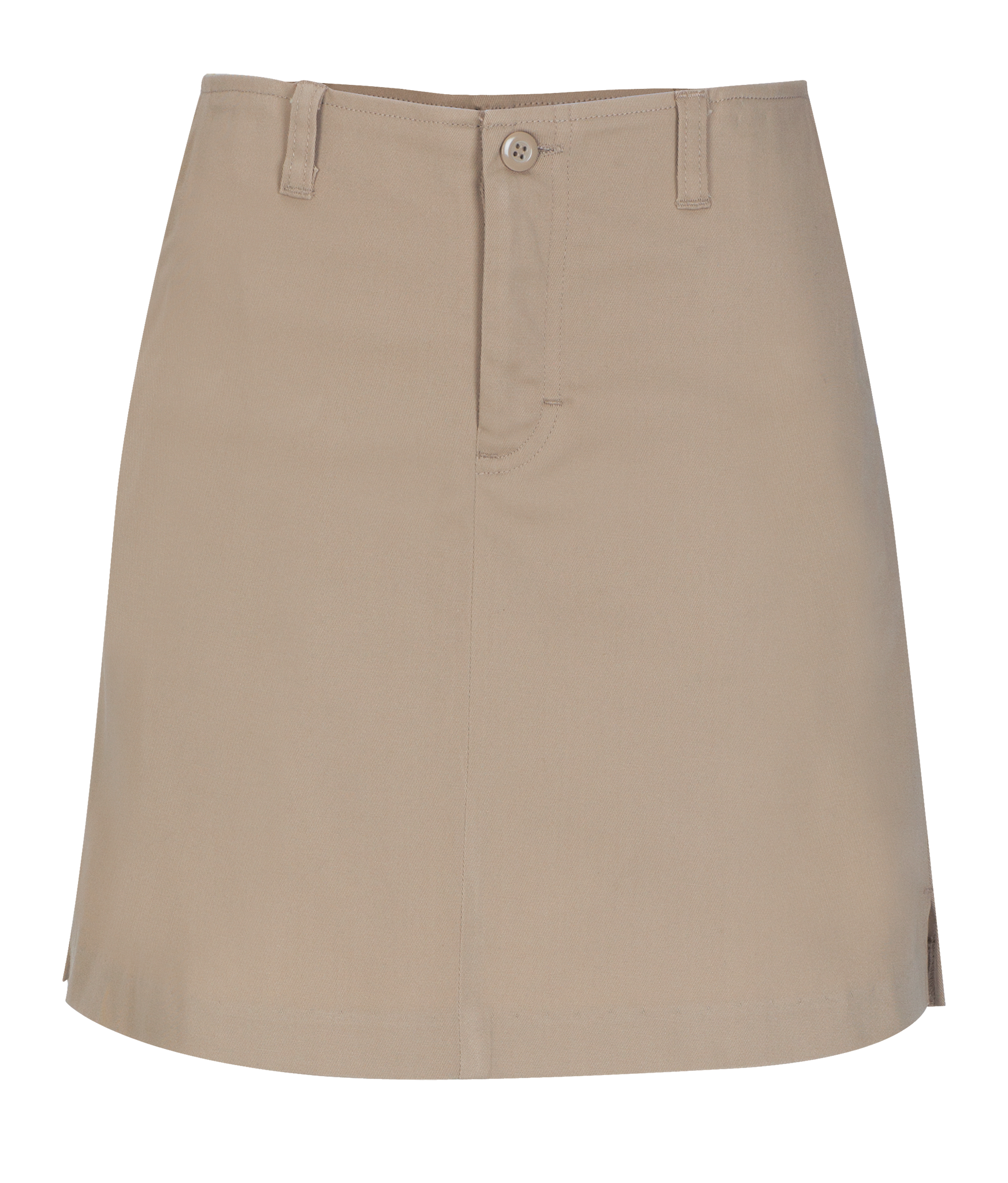 Feminine and functional girls scooter with flat back panel, fly front, full back elastic waist, slash pockets, and belt loops. Stretch fabric of cotton/poly/spandex blend has supple fit and feel with wash-and-wear ease.