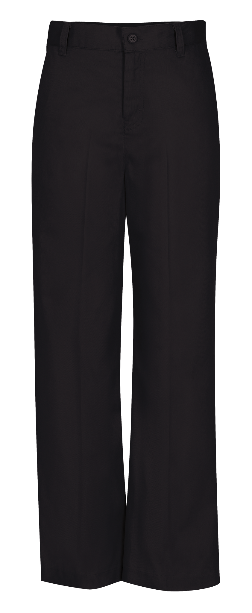 Girls flat front pant with side pockets and back welt pocket, full back elastic(4-6X),interior adjustable waist tabs(7-16), sits at the natural waist. Full straight leg. 53% Cotton / 44% Poly / 3% Spandex.