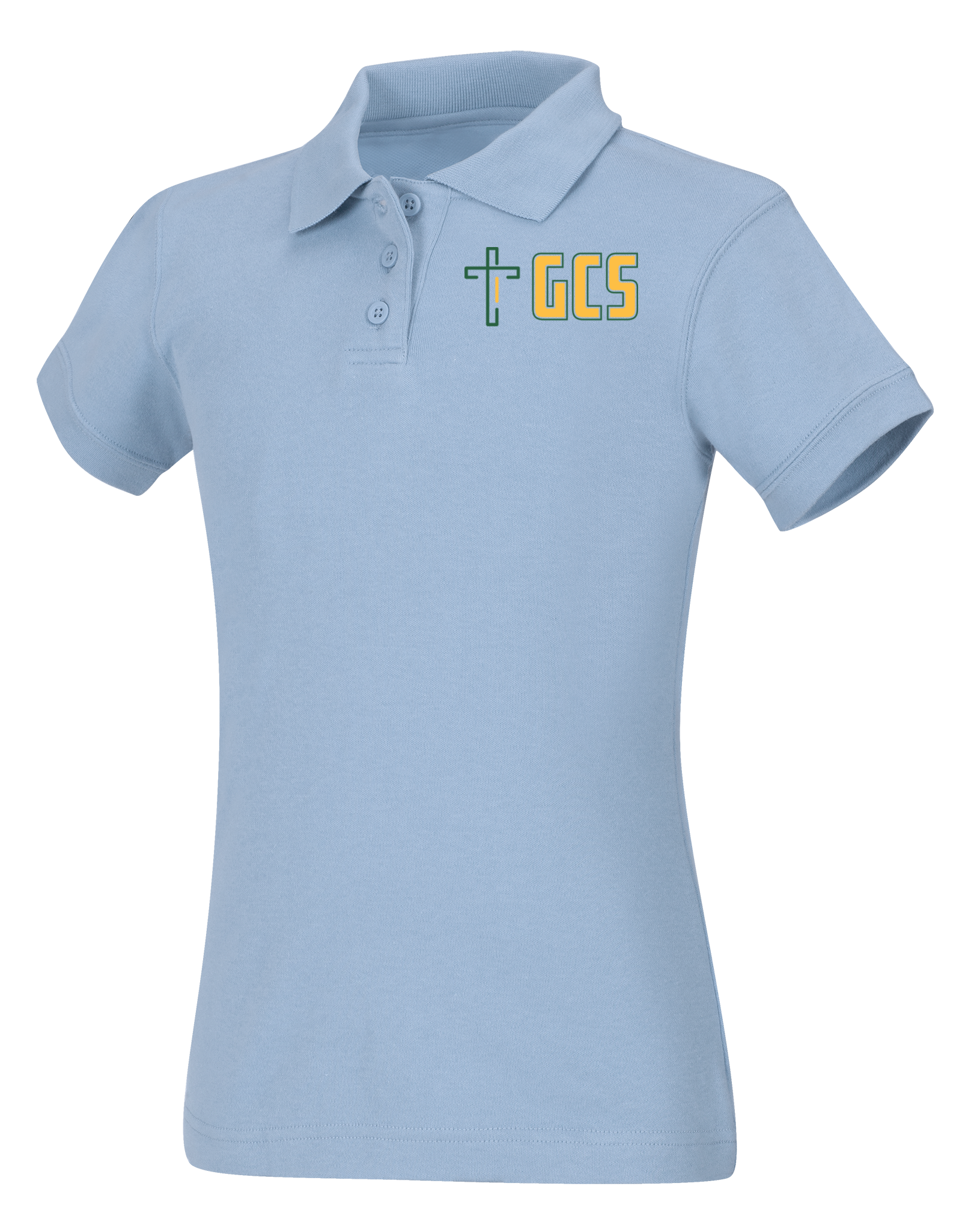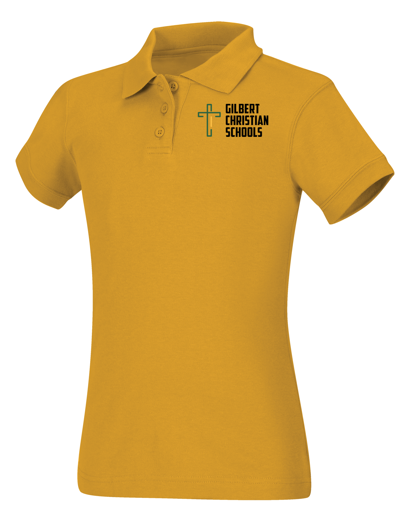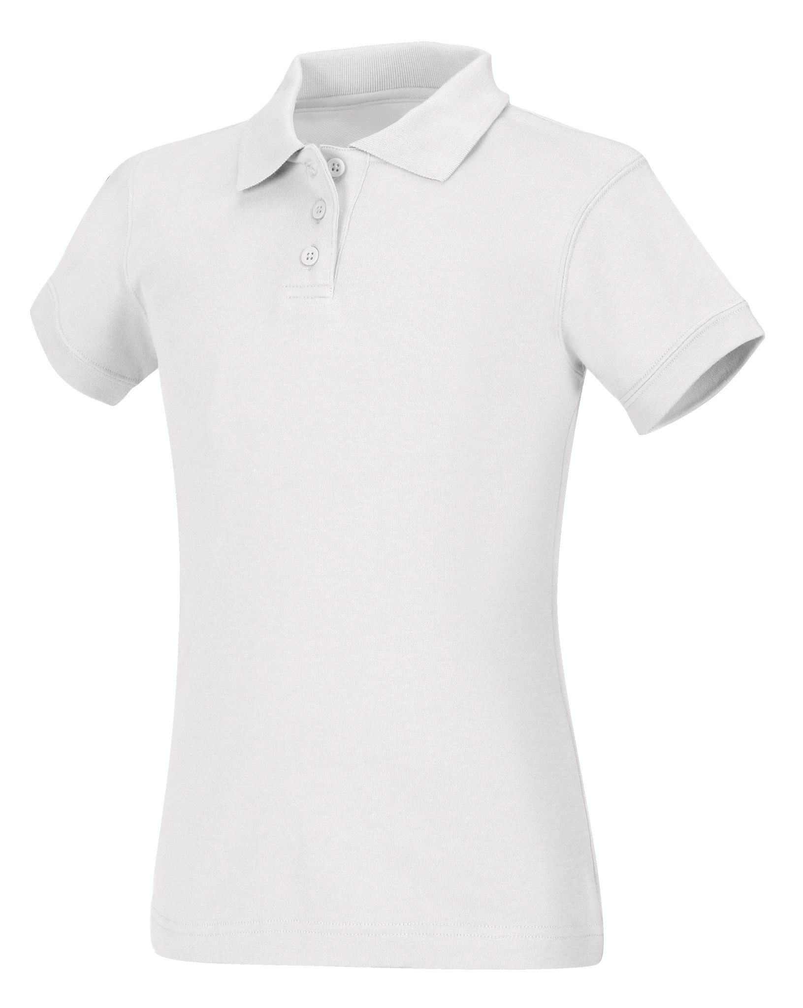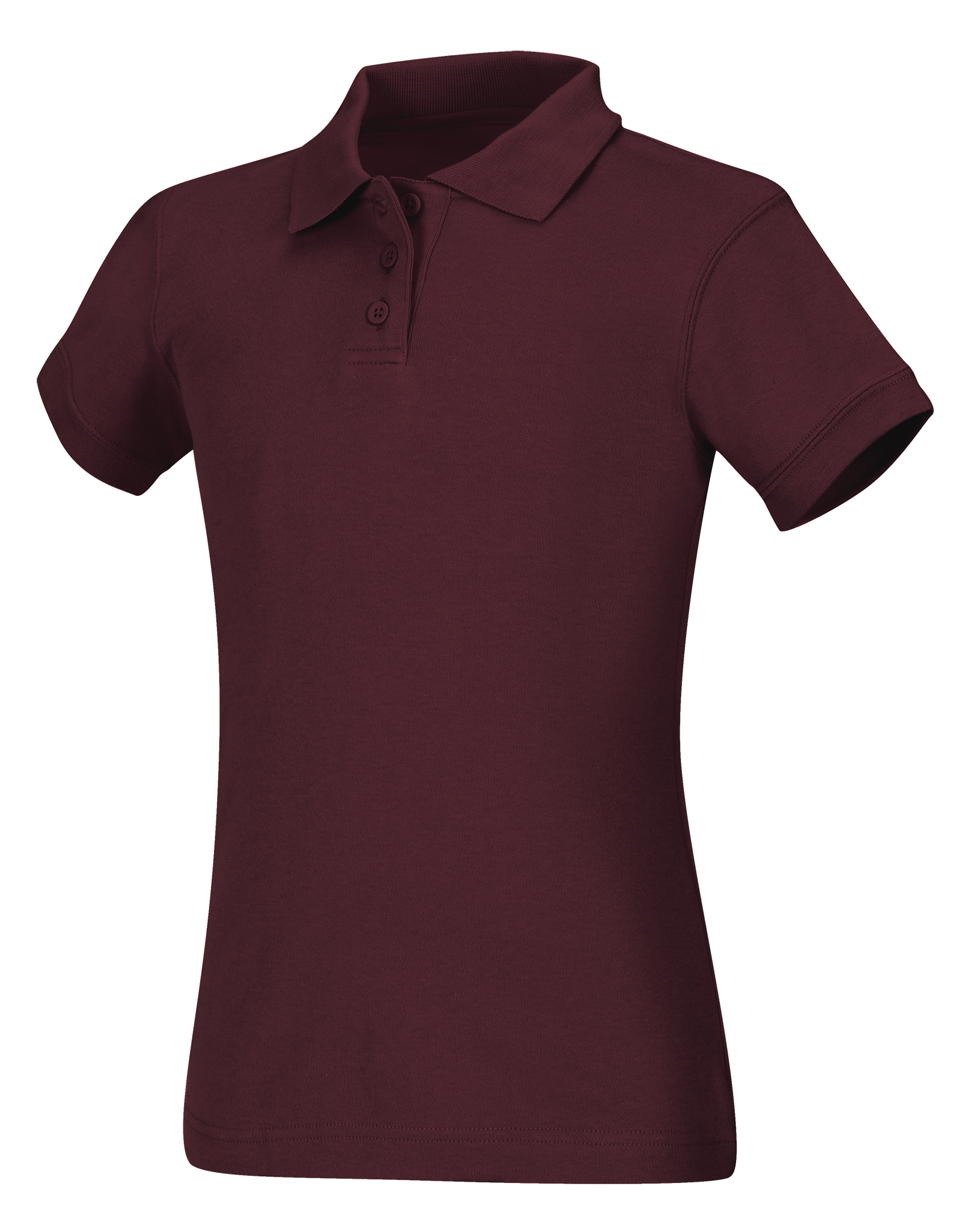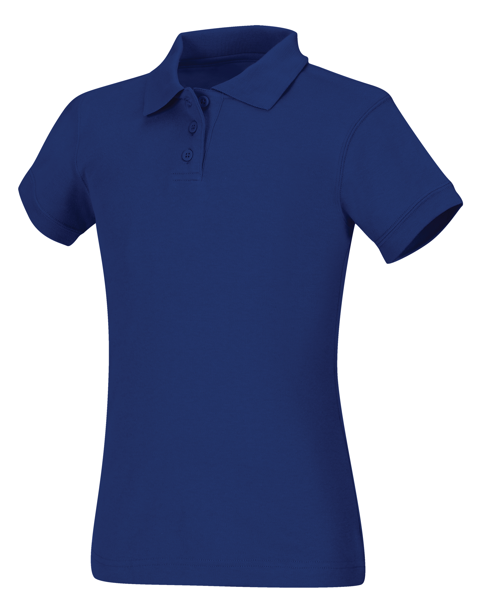 Juniors cap sleeve polo in interlock knit with 3 button placket (right over left) has softly fitted body . 60% cotton / 40% polyester interlock knit.