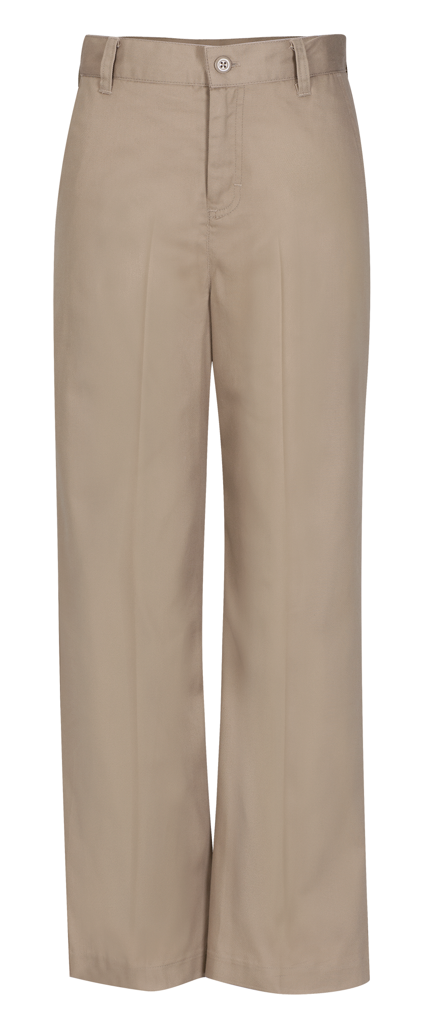 Juniors flat front pant with side pockets and back welt pocket, sits at the natural waist. Full straight leg. 53% Cotton / 44% Poly / 3% Spandex 30.5" Inseam.