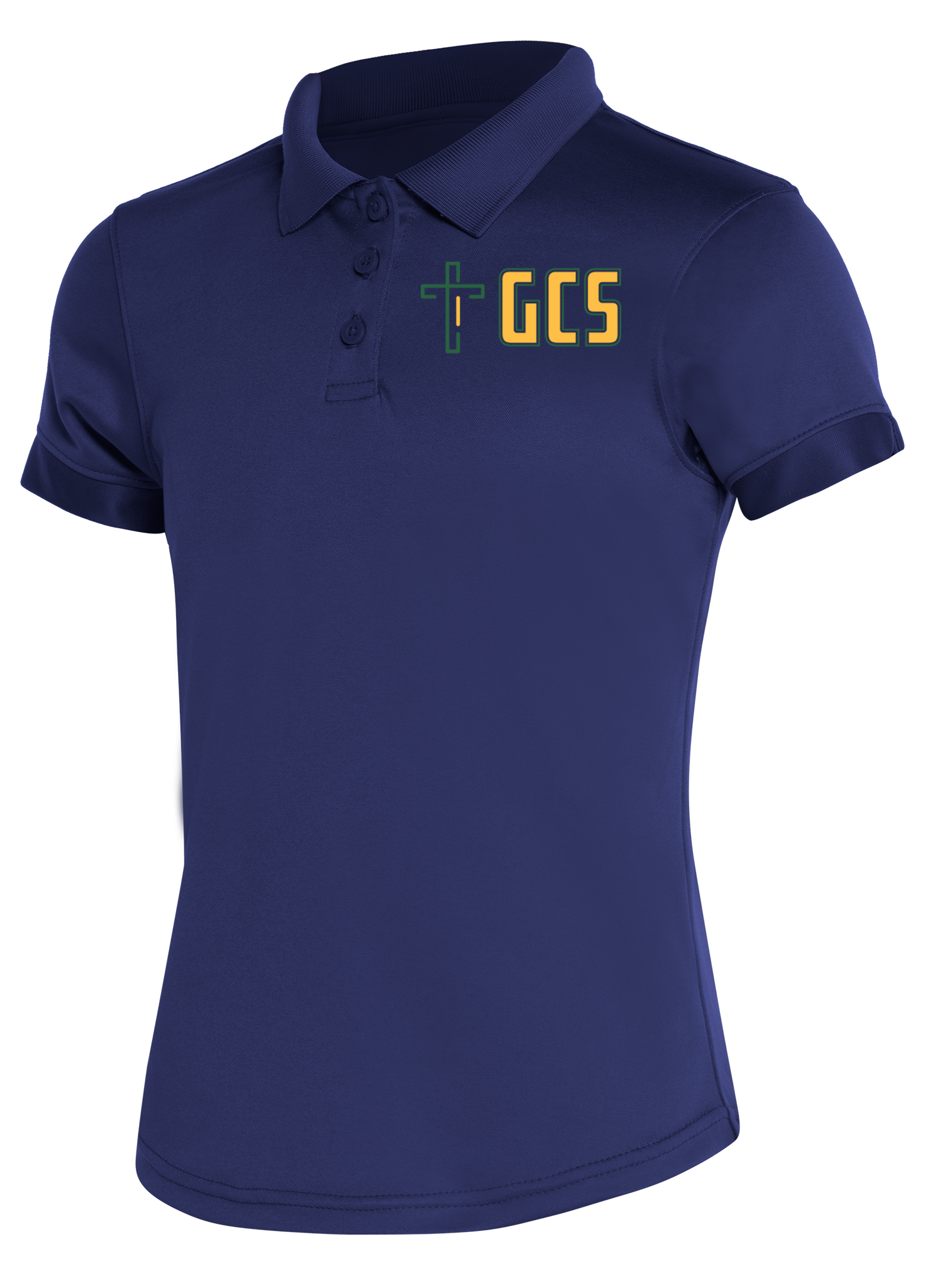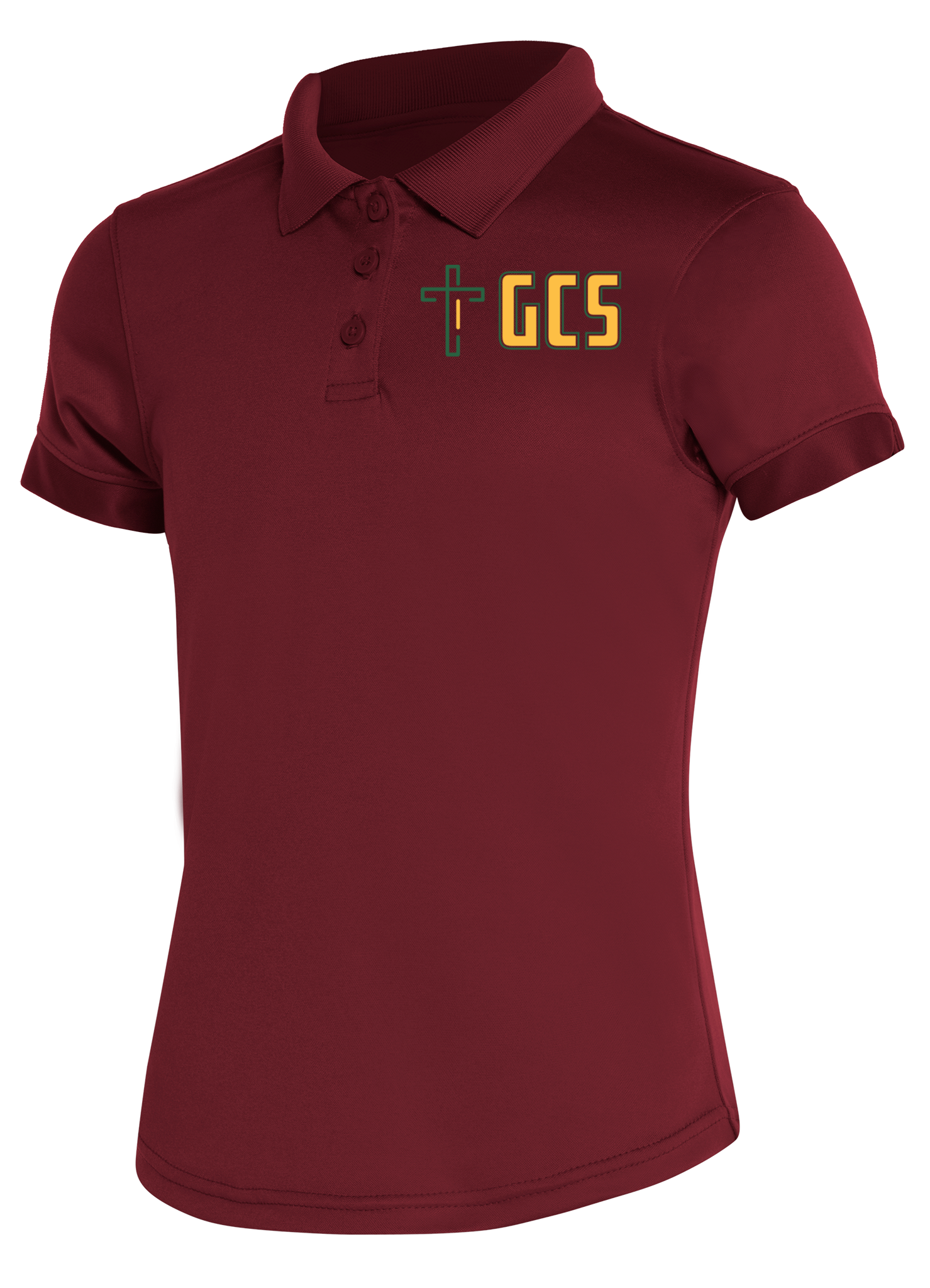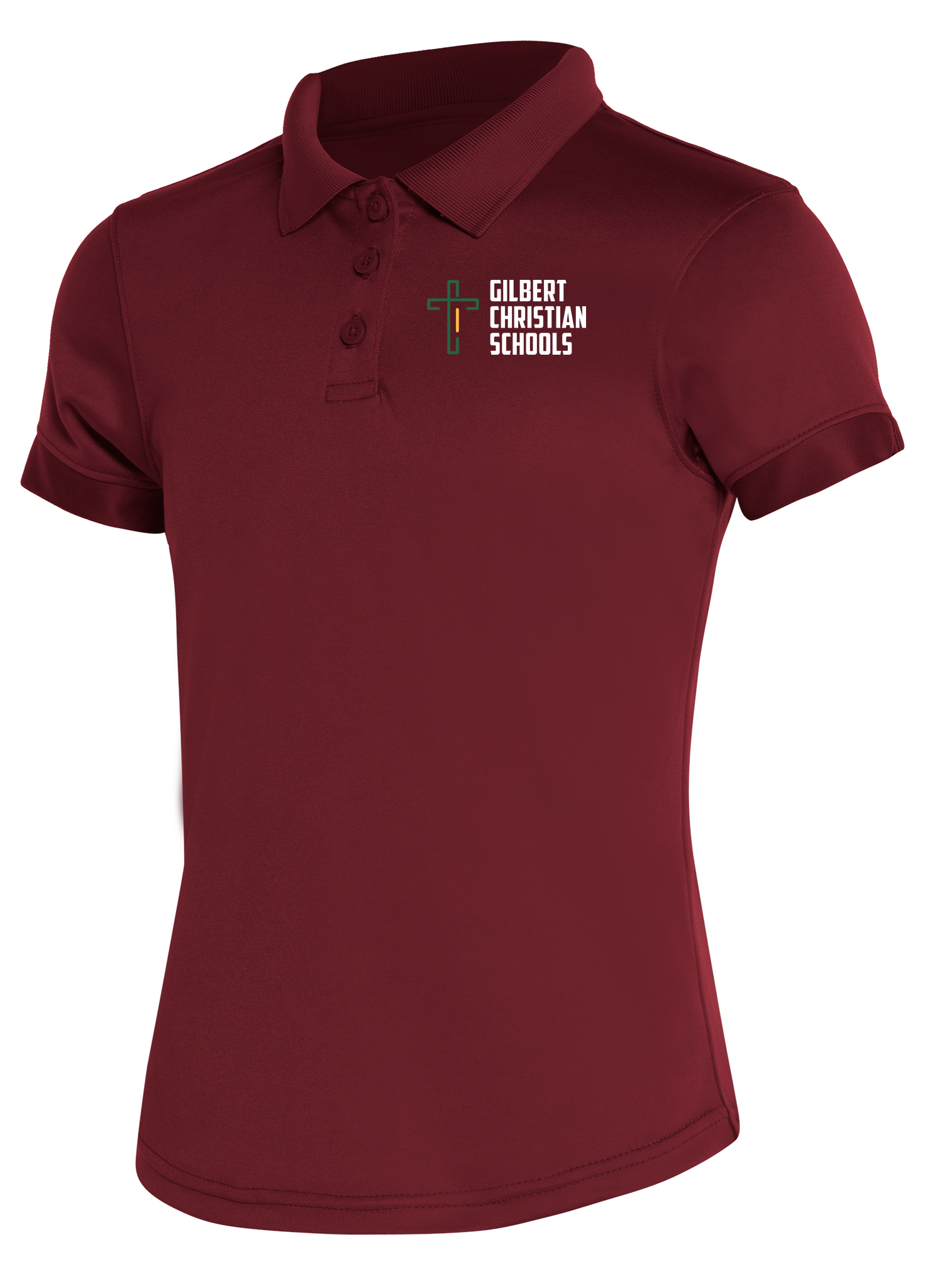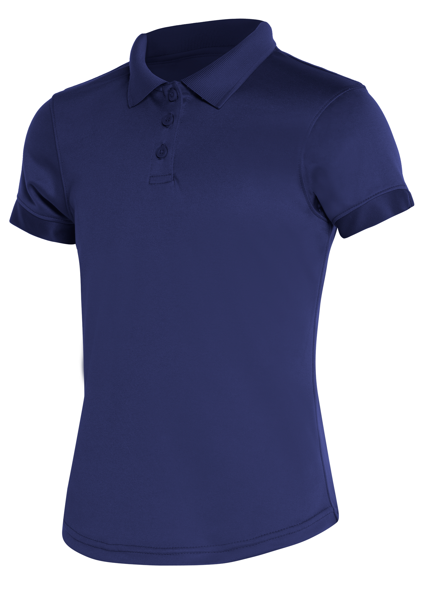 Feminine fit moisture wicking polo with matching ribbed collar, three button placket with dyed-to-match buttons. Stylish curved hemline with v-notch detail on sleeves. 100% Polyester.