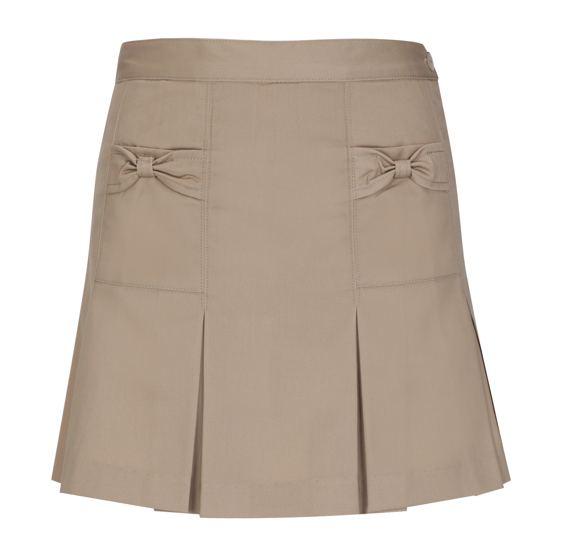 Twill scooter with bow pocket detail, four-pleat front, full elastic back with two flat seams, built-in poly knit shorts. 53% Cotton / 44% Polyester / 3% Spandex.