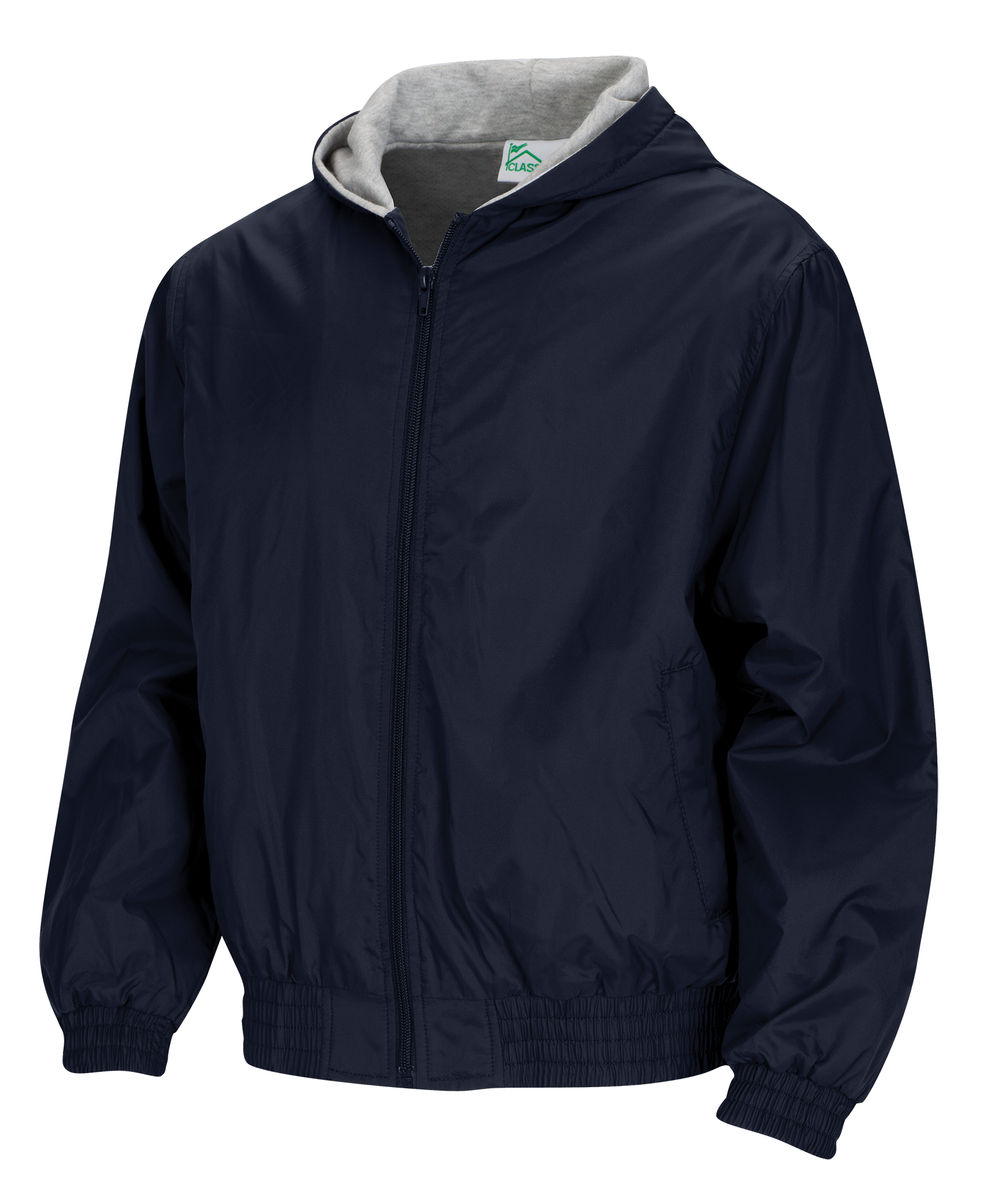 Hooded water-resistant nylon jacket, fully lined in fleece knit with front zip closure, two front pockets, reflective zipper tab, and elasticized cuffs and waistband. Outer shell is 100% Nylon, inside lining is a brushed polyester/rayon/nylon fleece.