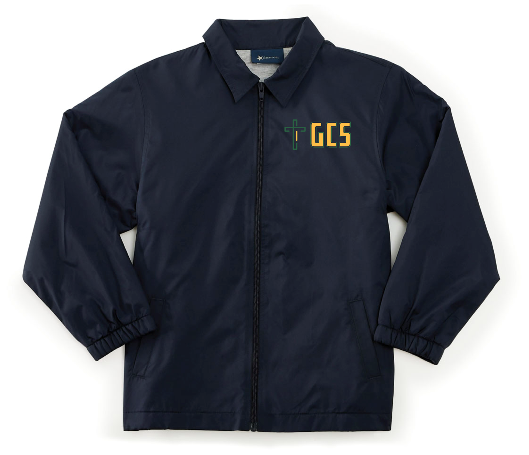 This nylon coach jacket with soft fleece lining features a classic collar, dyed-to-match zipper closure and elastic cuffs. There are two front welt pockets and inside chest pocket for storage. Adult-size, Unisex fit. 100% nylon taffeta shell, reversed fleece inner liner.
